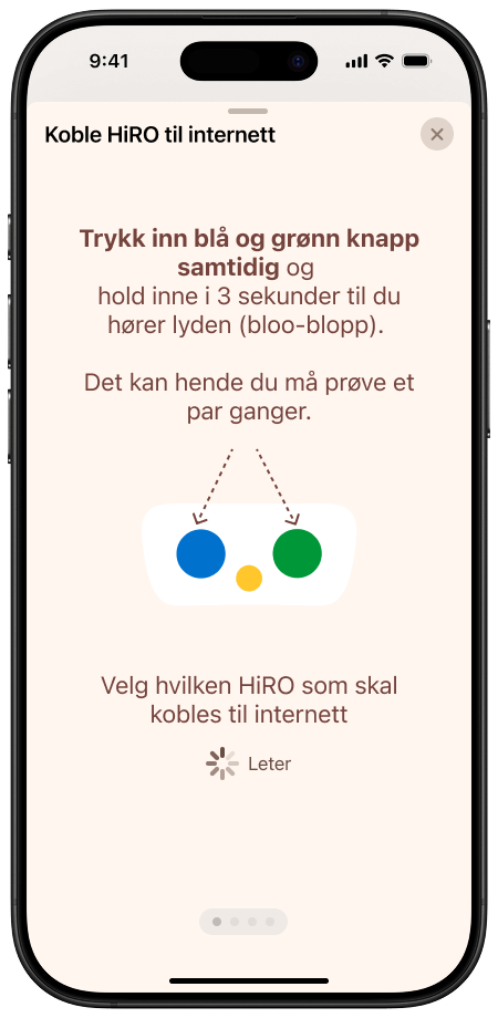 Når du har hørt lyden så kan du slippe knappene og vente noen sekunder til HiRO dukker opp i en blå knapp. Trykk på den blå knappen i appen.