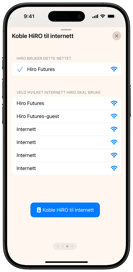 Du må nå velge ditt wifi-nettverk og skrive inn passordet slik at HiRO kan koble seg til internett.