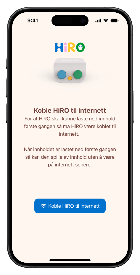 For at HiRO skal kunne laste ned innhold og gjøre automatiske oppdateringer så trenger den å kobles til internett. Du må laste ned HiRO Speaker appen til iPhone eller Android.